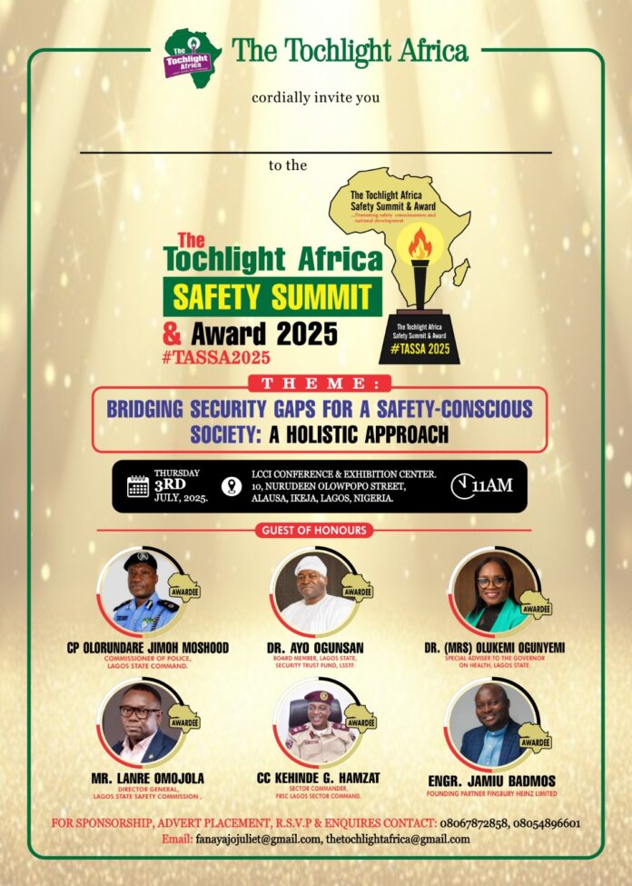 The Torchlight Africa Initiative has announced plans to host the inaugural Torchlight Africa Safety Summit and Award (TASSA 2025), bringing together the nation’s foremost safety experts, policymakers and industry leaders in what promises to be a landmark event for national security development. The summit, scheduled for July 3rd at the LCCI Conference & Exhibition Center in Alausa, Ikeja, will convene under the theme “Bridging Security Gaps For A Safety-Conscious Society: A Holistic Approach.”