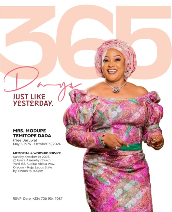 A one-year memorial service in her honour will be held on Sunday, October 19, 2025, at Grace Assembly Church, Yard 158, Kudirat Abiola Way, Oregun-Ikeja, Lagos, from 12:00 noon to 1:00 p.m.