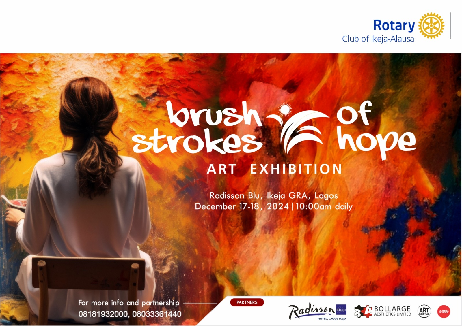 The Rotary Club of Ikeja-Alausa, in partnership with Radisson Blu, is set to host a two-day art exhibition titled Brush Strokes of Hope, scheduled to take place on the 17th and 18th of December 2024.