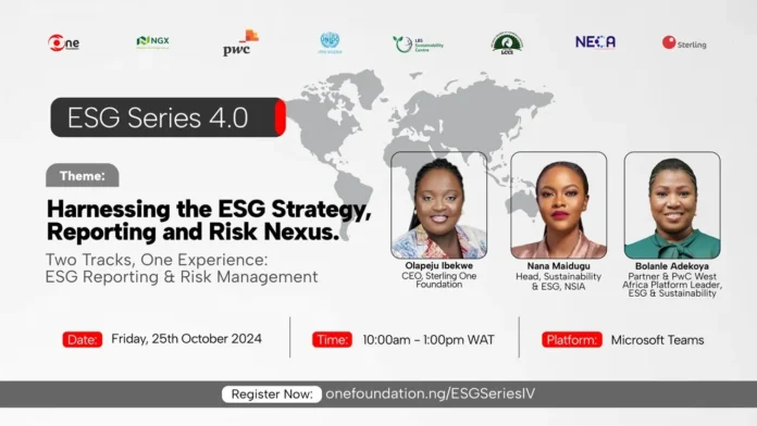 Sterling One Foundation, in partnership with PwC, NGX, UNIDO Investment and Technology Promotion Office (ITPO) Nigeria, LBS Sustainability Centre, Lagos Chamber of Commerce & Industry (LCCI), Nigeria Employers’ Consultative Association (NECA), and Sterling Bank, is set to host ESG Series 4.0 on October 25, 2024.
